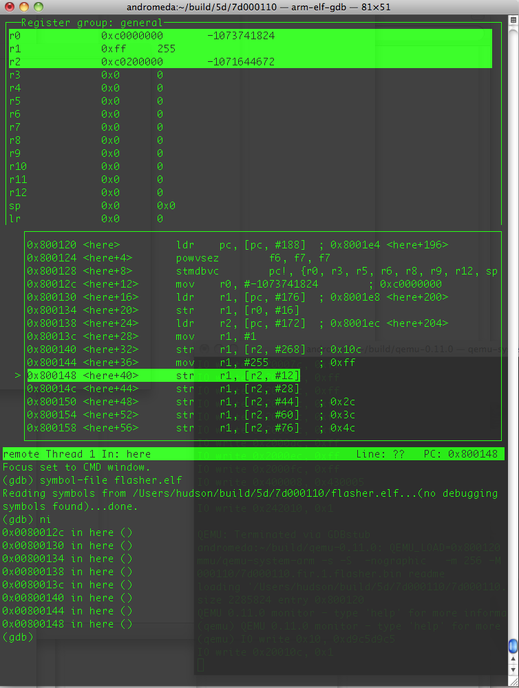 target remote localhost:1234 set language asm layout asm layout regs focus cmd symbol-file flasher.elf # Break if we enter the infinite loop of death br *0x8009f4