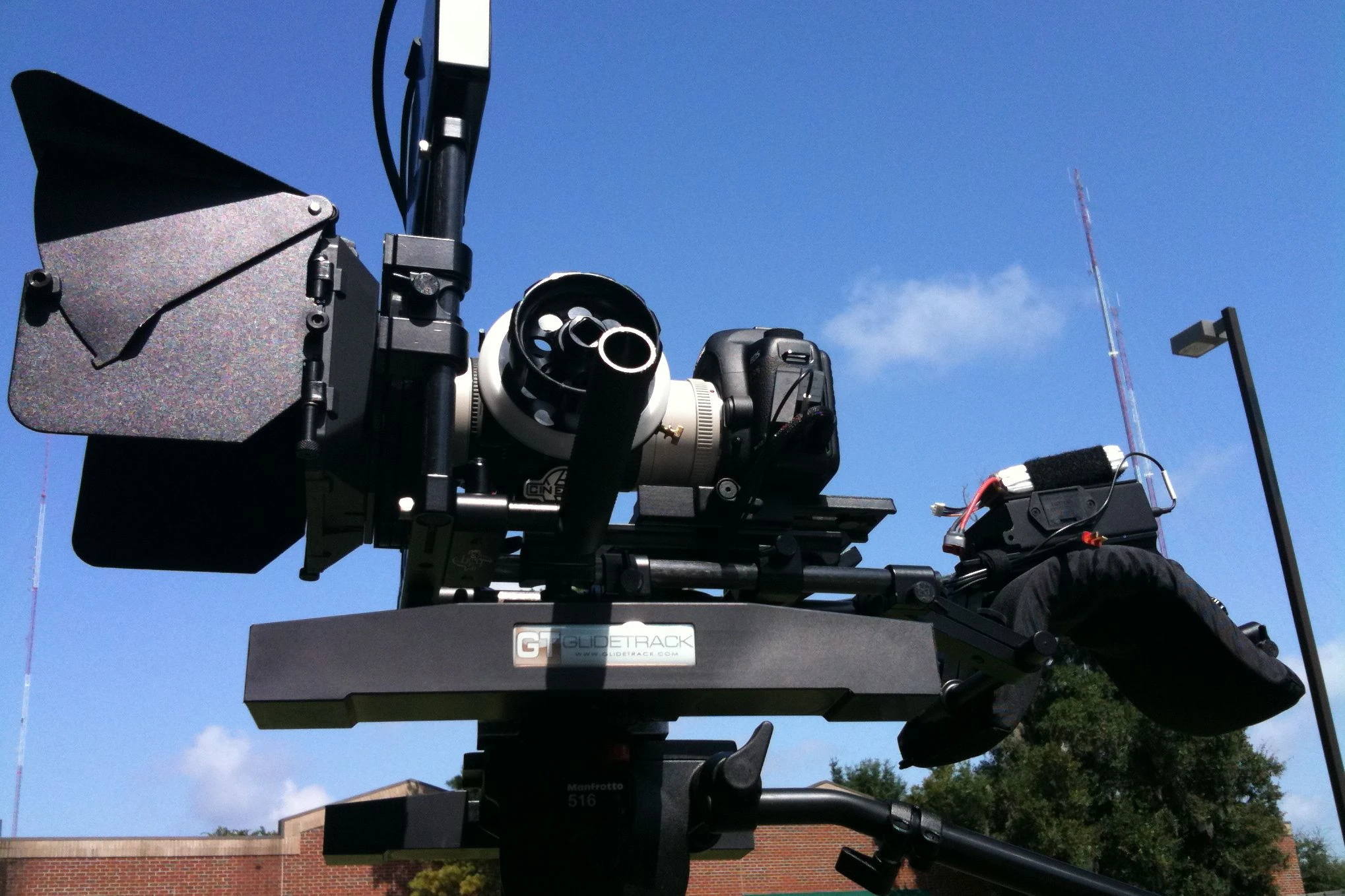 5D Mark II with Cinevate DSLR rig, juicedLink CX231, SmallHD DP1 and Glidetrack HD on a Bogen 516/3192