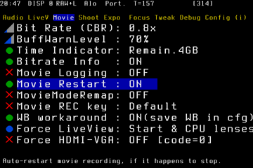 - Movie helpers: Bitrate control (QScale or CBR), movie logging (Exif-like metadata), auto-restart after buffer overflow or 4 GB limit, clean LiveView display without any overlays, change movie position on the mode dial.
