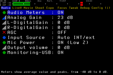 - LCD sensor + LEFT / RIGHT in LiveView: adjust audio gain (volume for recording).